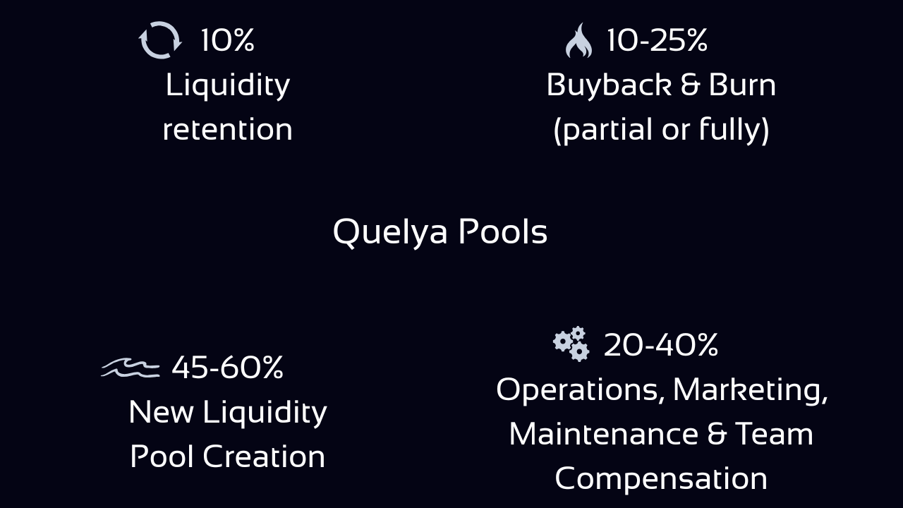 Quelya’s deflationary tokenomics are governed by three key mechanisms: